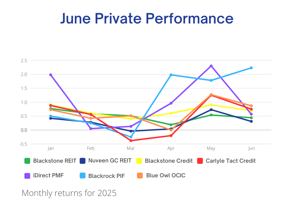 iDirect Private Markets Fund also delivered a solid +0.57% for the month, closing the first half of 2025 at +6.12% YTD. Allocations to KKR, Vista Equity, and Warburg Pincus continue to provide diversified access to institutional-quality private equity deals across high-growth industries.